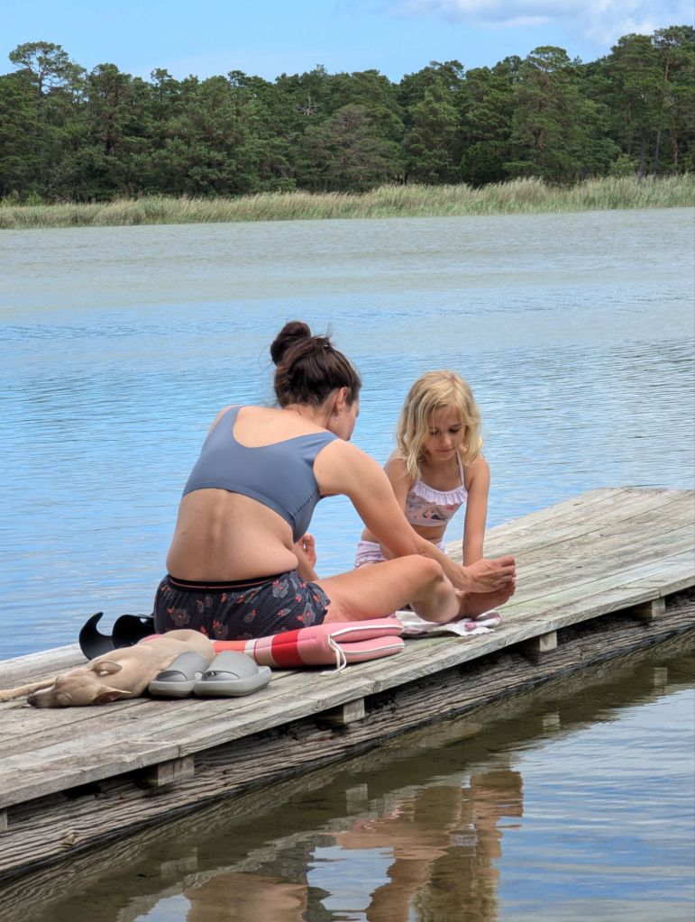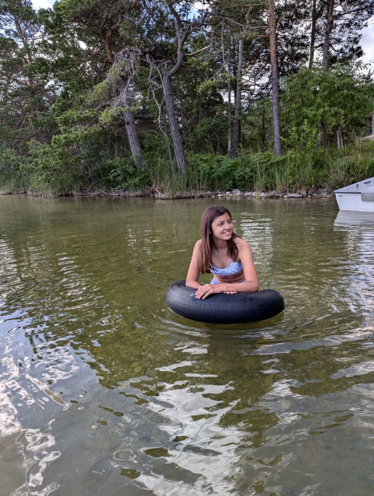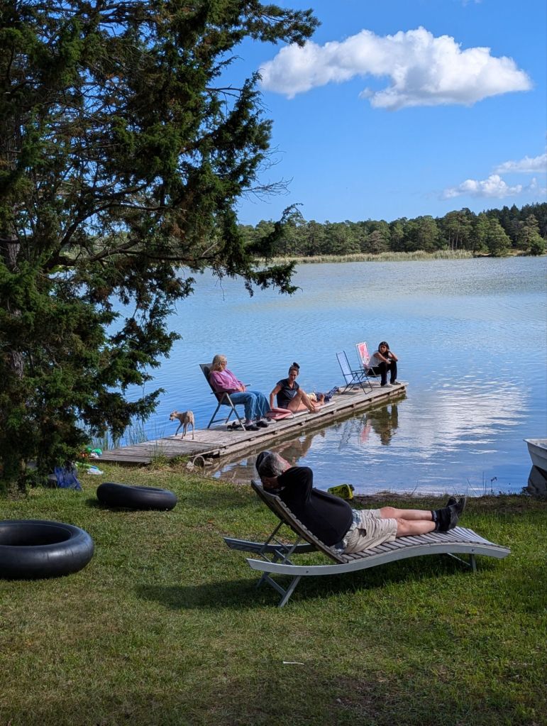 Det var även svalare i vattnet, kände jag när jag var i och tvättade mig. Tjejerna var med på bryggan och doppade fötterna. De hejade på mig att jag skulle doppa mig, och inte bara stå på badstegen och blaska mig. Så ett dopp blev det!