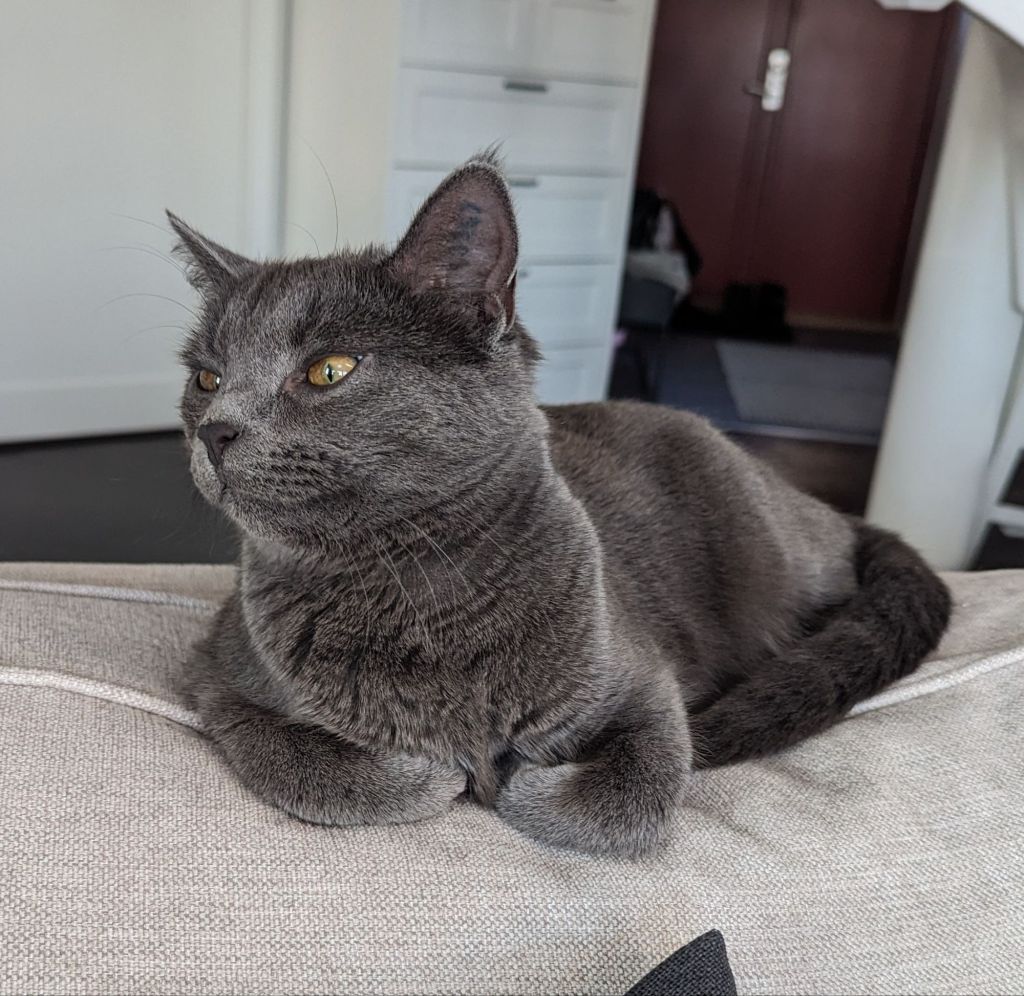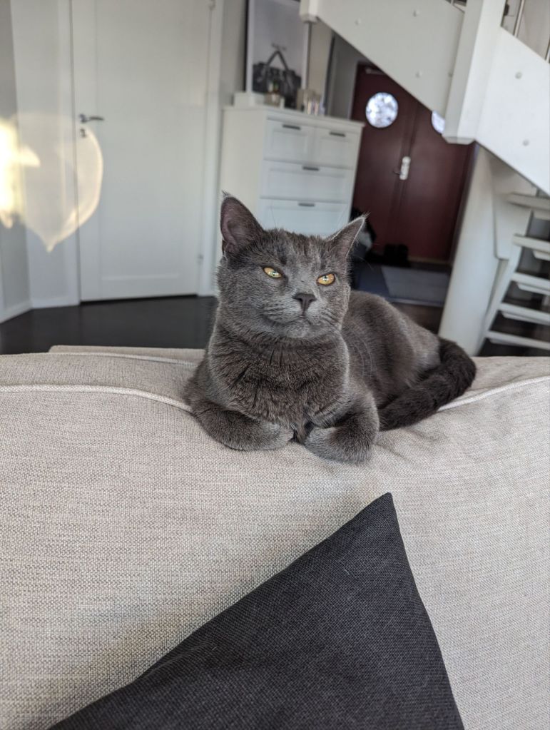 Efter en stund kom även Bimbo ut, hoppade upp i mitt knä, la sig tillrätta och njöt av solen.