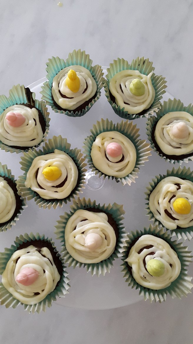 Igår fixade jag en Smögenpaj och så gjorde jag matiga våfflor och så kluttade syrran och jag silllgodis (en gucka med matjesill) på knäckebitar och en annan äggucka på våffelhjärtan. Styvmor hade med sig sill och en Jansson och Svågern gjorde smarriga köttbullar. Och så kom Svågerns morföräldrar, moster och kusin och vi åt och hade trevligt tillsammans. Syrran hade bakat morotskakecupcakes till kaffet. Med små kycklingar på! Så söta!