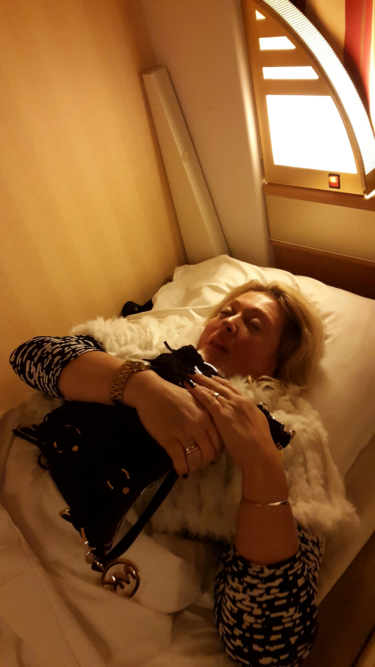 Då får ens vänner bädda ner en ett tag. Sen är man på topp igen och kan parta till 6 på morgonen! Fniss!! Lägg märke till handväskan, som det var mycket viktigt att ha med i sängen.