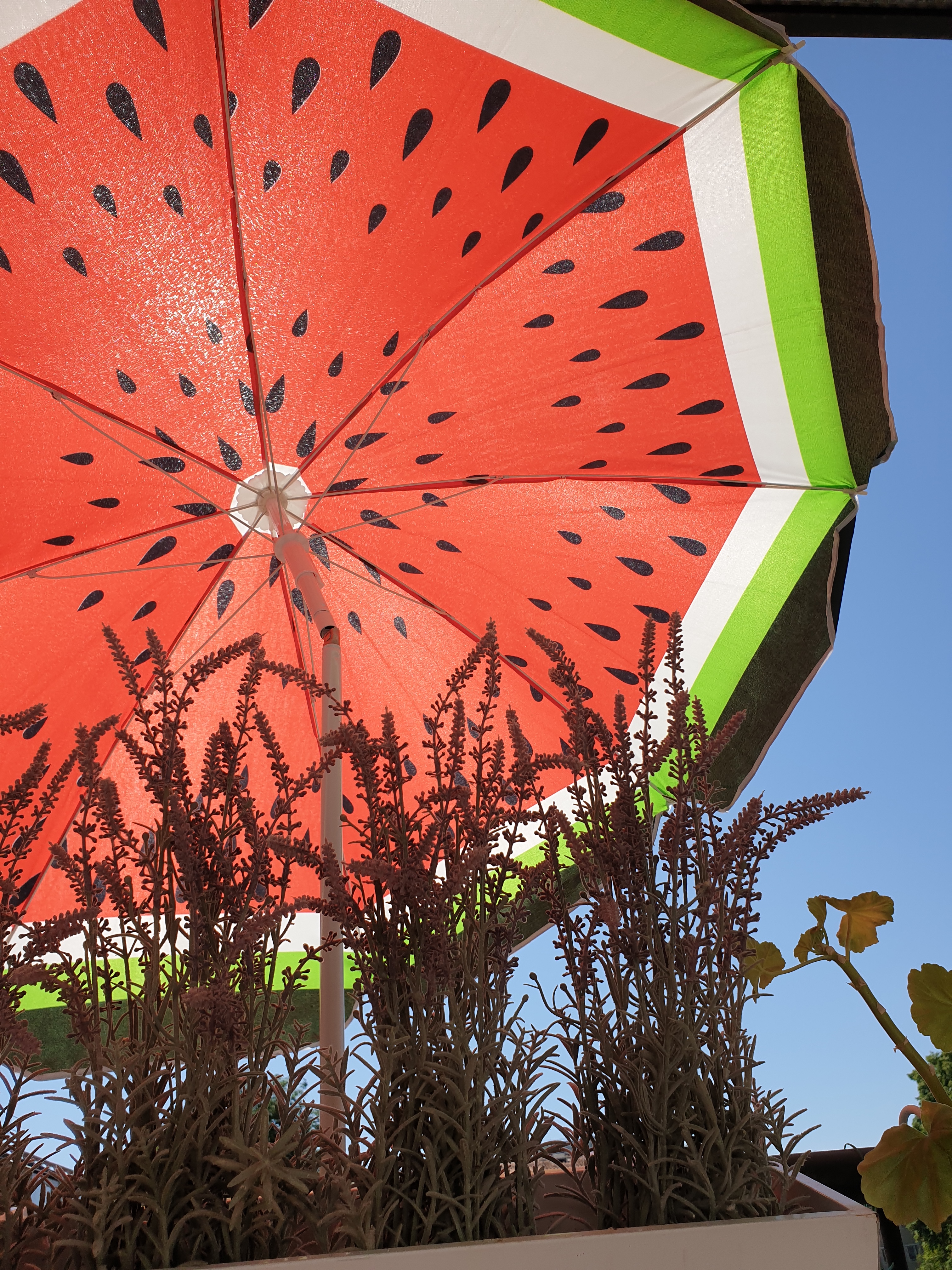 Parasollet uppfällt, annars går det absolut inte att sitta här dagtid. Ibland kommer en liten, liten vindfläkt som tur är!