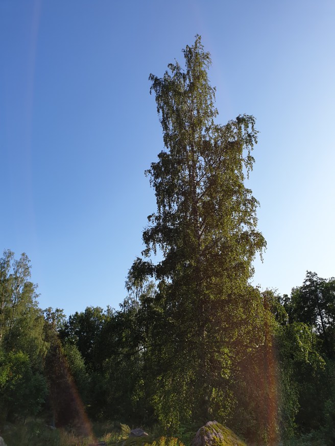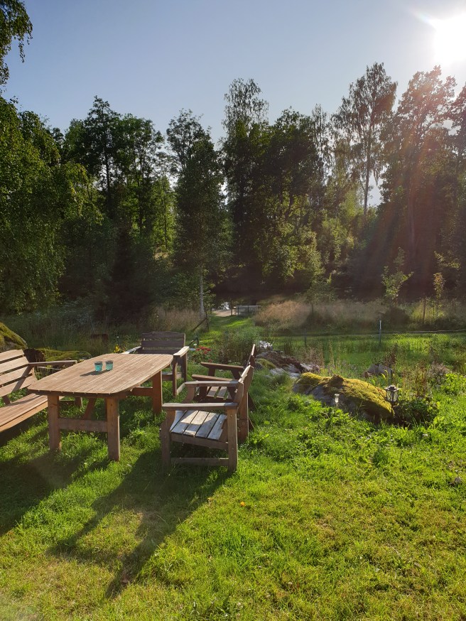 När jag kom till stugan sken solen, så jag satte mig ute med ett mellis och en kopp kaffe. Sen mörknande himlen mer och mer, så jag gick in. Då började det regna. Och efter ett tag klarnade det upp och det var sol och klarblå himmel.