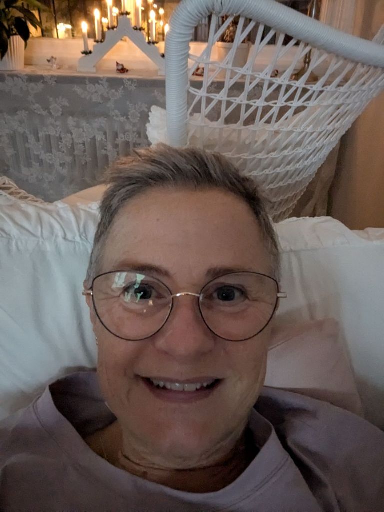 När jag klev upp så rev jag ur lakanen och även örngotten på kuddarna i soffan. Insåg att jag ju ligger på dem varje kväll och att det nog kan vara dags att de tvättas oxå. Sen frukost i lugn och ro. Och sen in i duschen och på med jeans och topp. ”Riktiga” kläder, inte bara myskläder. Hann oxå vattna växterna, sen messade Kerran att hon var utanför, så jag gick ner och mötte henne.