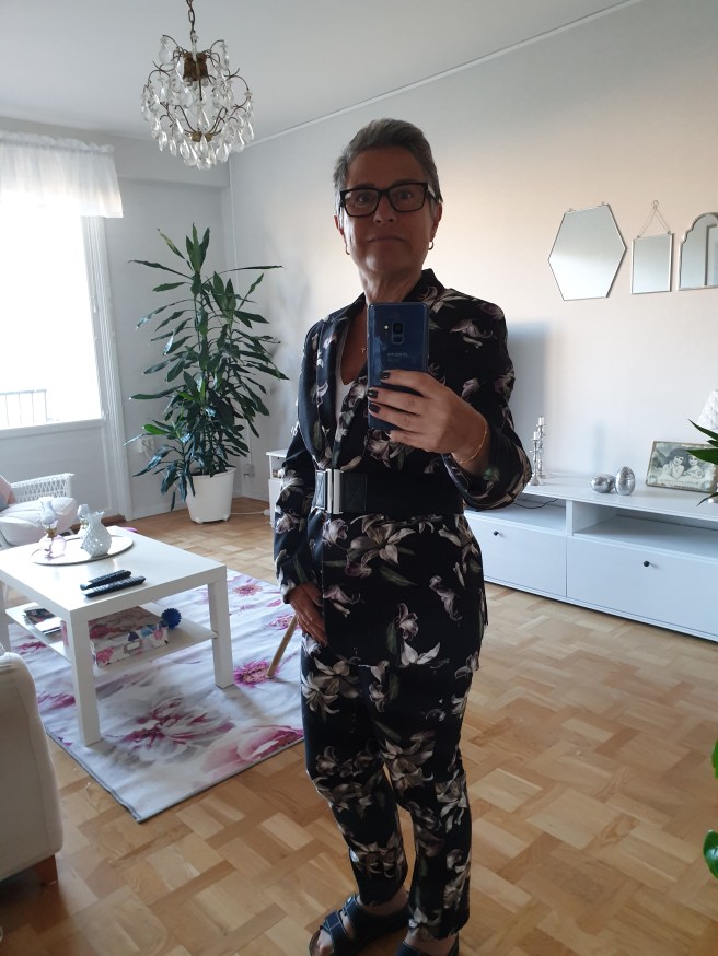 Jag tycker den är så snygg! Men… Jag känner mig inte bekväm i kavaj. Det är så snyggt när andra har det. Men jag tycker det känns stelt, som att jag har ett ytterplagg på mig inne. Så rätt snart brukar den åka av. Idag satte jag ett brett resårskärp i midjan, får se om det kanske kan göra att jag känner mig mindre som att jag har en jacka på mig. Varför det nu skulle det…