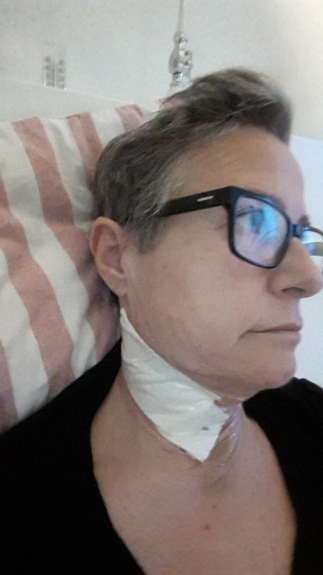 Sedan har jag då nu ett ärr (snart, än är det ju inte helt läkt) på halsen. Och 1 ärr på hakan efter att jag slog upp den som 14-åring och fick sy ihop det. Och ett ärr i pannan efter att jag ramlade och slog huvudet i en sten som liten, 4-5 år tror jag att jag var.