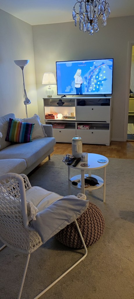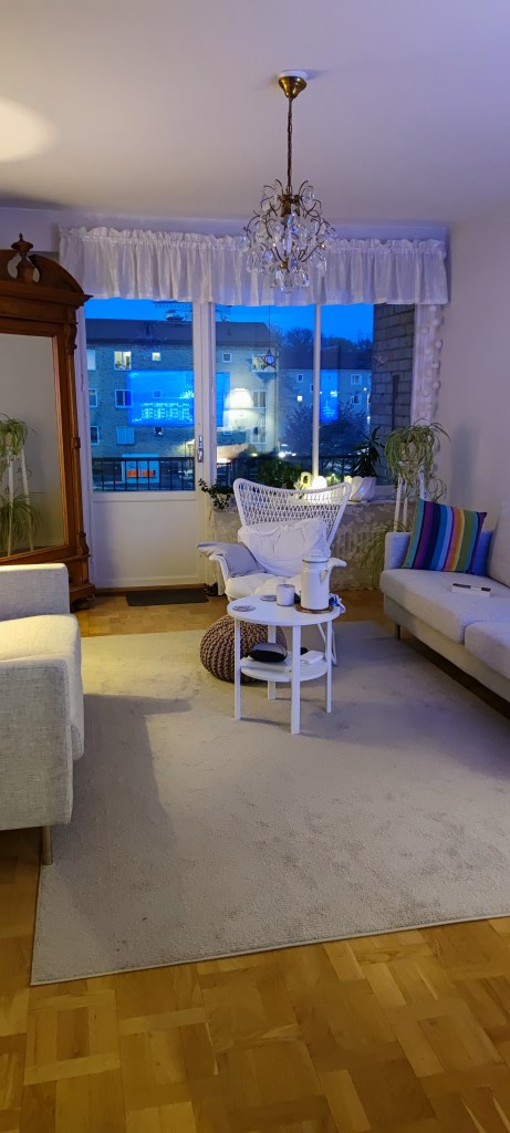 Toyboy, Nettis och jag bokade biljetter till Gotlandsfärjan tillsammans. Så nu är det klart, bokat och betalt! Yippieee! Sen åkte jag hemåt igen. Tog med en liten skål jordnötter och 1 glas vit sangria och satte mig i min nya soffa och kollade på TV. Då och då gick jag upp och fixade nåt i vardagsrummet. Bytte plats på lampor flera gånger och nu är jag supernöjd! Det blev så himla fint!! Jag är verkligen nöjd med vardagsrummet nu! Och när nya bordet kommer blir det riktigt bra!