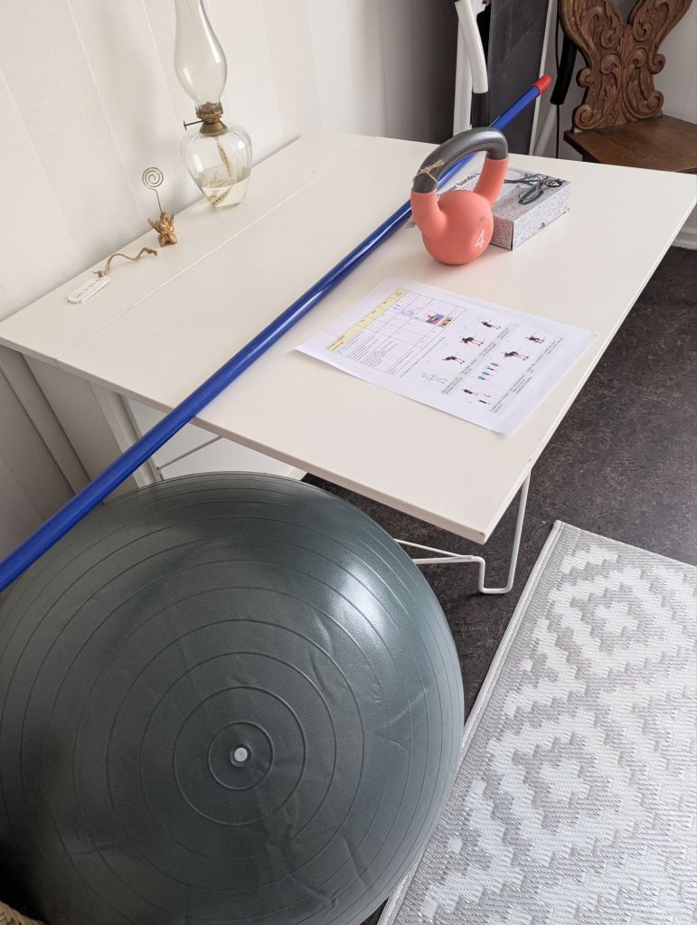 Igår när jag slutade jobba på hemmakontoret så tog jag bilen och drog iväg till Rusta för att köpa en gymboll/pilatesboll. Och hoppsan, de hade tag 3 betala för 2 på träningsgrejjer. Så då passade jag på och köpte en kettlebell och ett gummiband också!