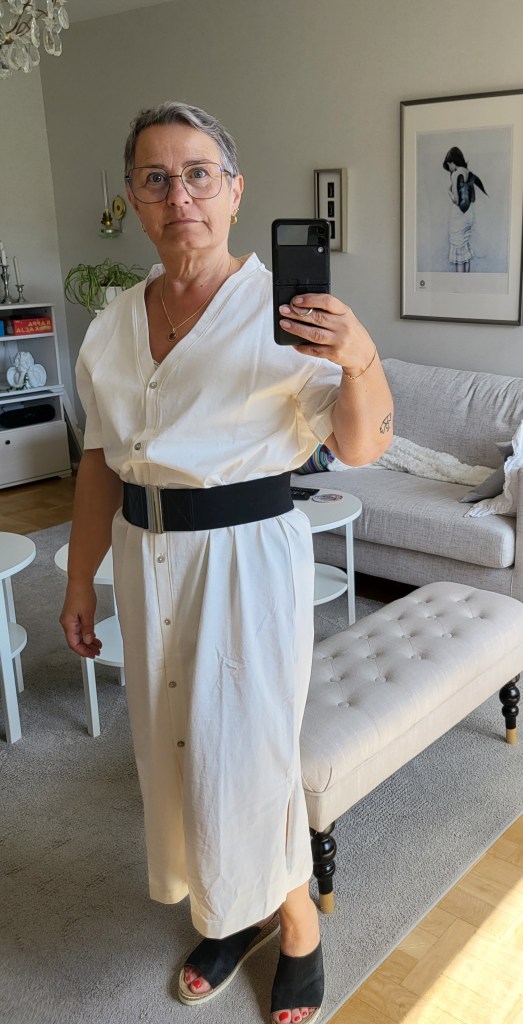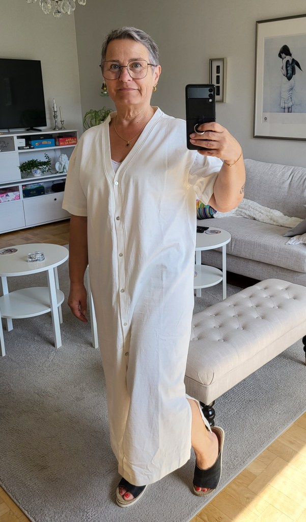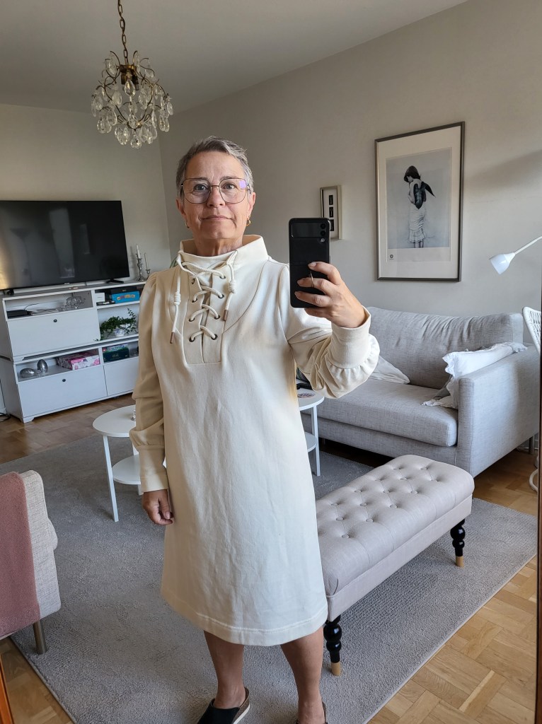 Nej, den är inte på idag dock. Jag ska jobba på hemmakontoret och sov som en kratta inatt av någon anledning. Så det är myskläder på, och kuddfrisyr. Så bild med klänning blir en annan dag.