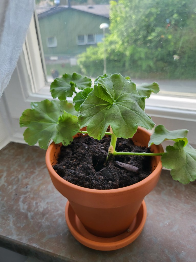 När jag kom hem så planterade jag pelargonskottet som börjat få små rötter. Så nu hoppas jag den överlever och frodas.