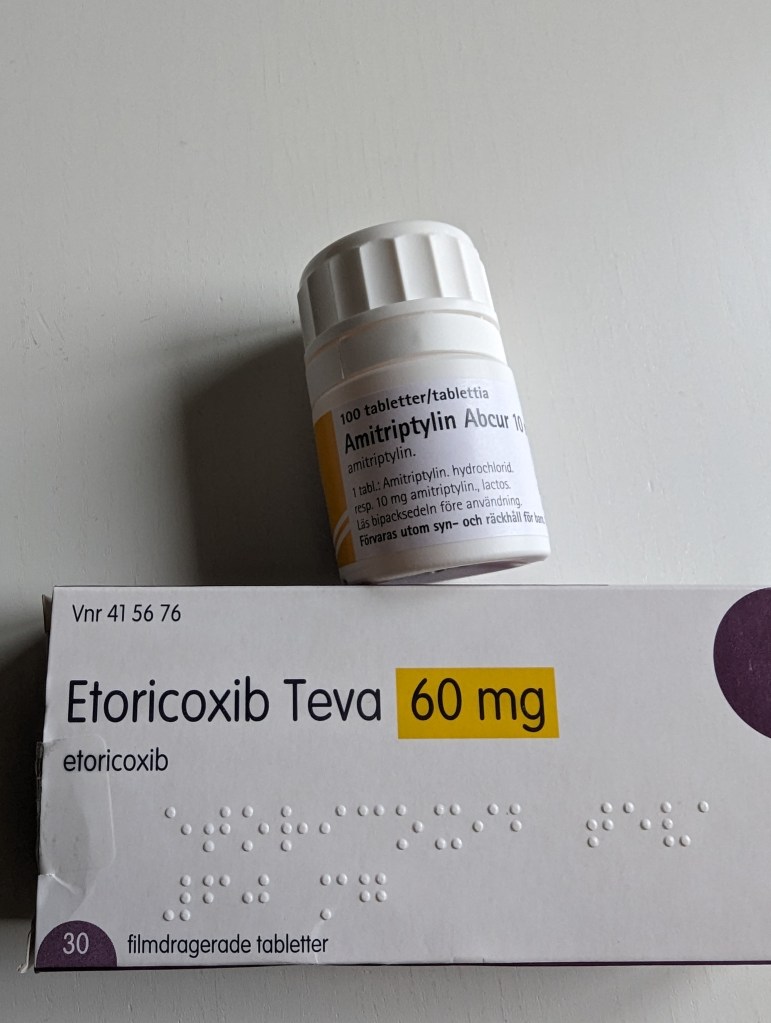 Han skrev ut annan smärtmedicin som jag ska testa. 1 tablett på morgonen, smärtis och antiinflammatorisk, och 1 annan smärtis till natten. Den till natten är enbart smärtis och ska verka 24 timmar. Och efter 3 dagar kan jag höja dosen om det behövs. Successivt kan man höja till 5 tabletter om det behövs. Så nu hoppas jag att det ska funka!