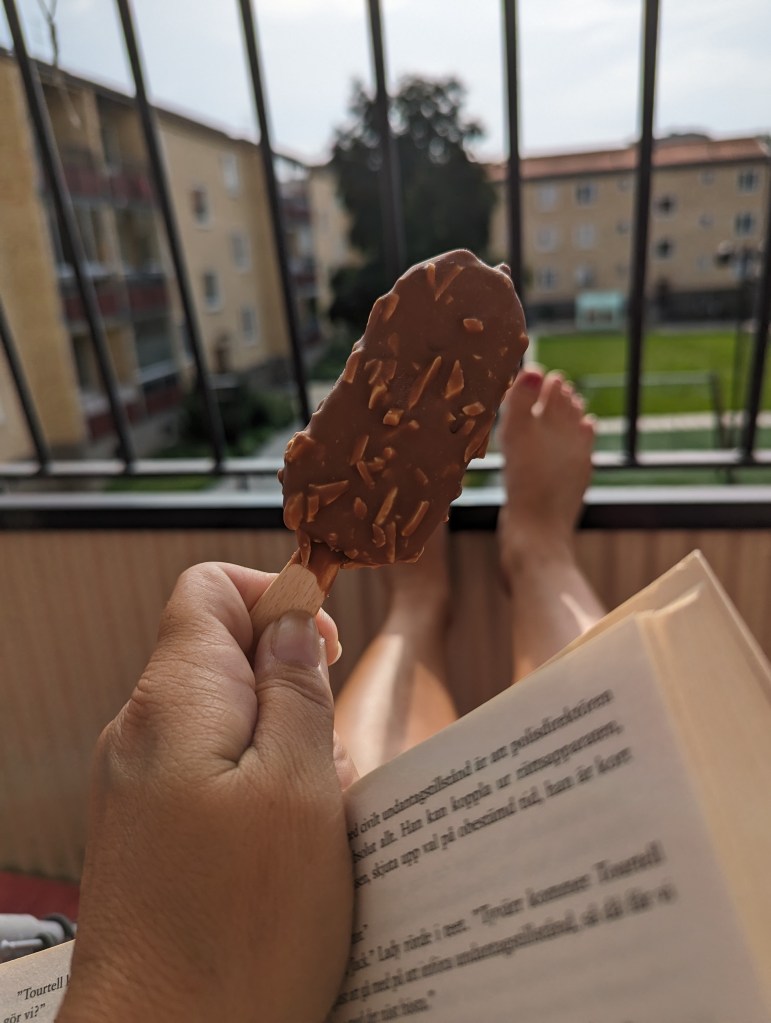 Även igår var det sol och varmt. Så ut på balkongen på lunchen, med bok och mat.