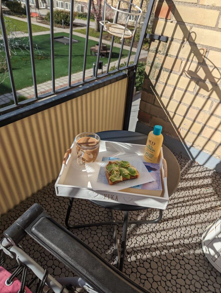 Nu sitter jag på balkongen, årets första utomhusfrukost.