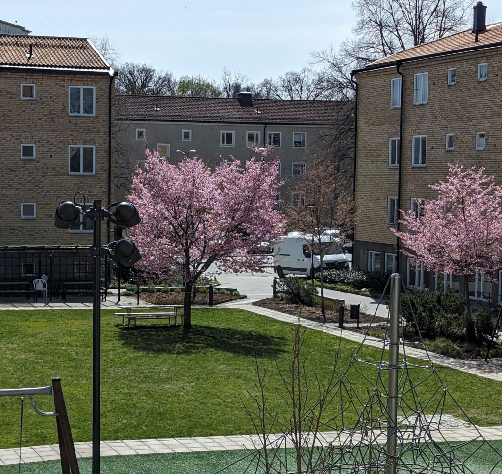 Det är så fint på gården nu, med 2 träd fulla av rosa blommor.