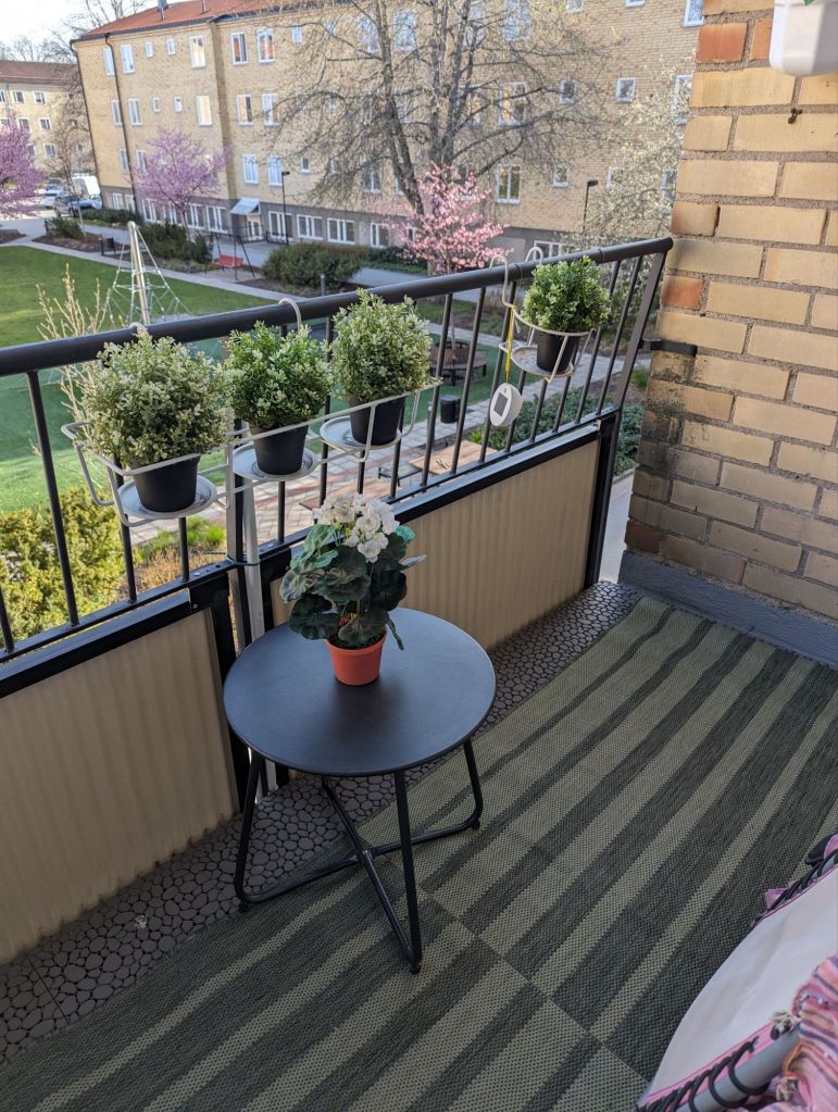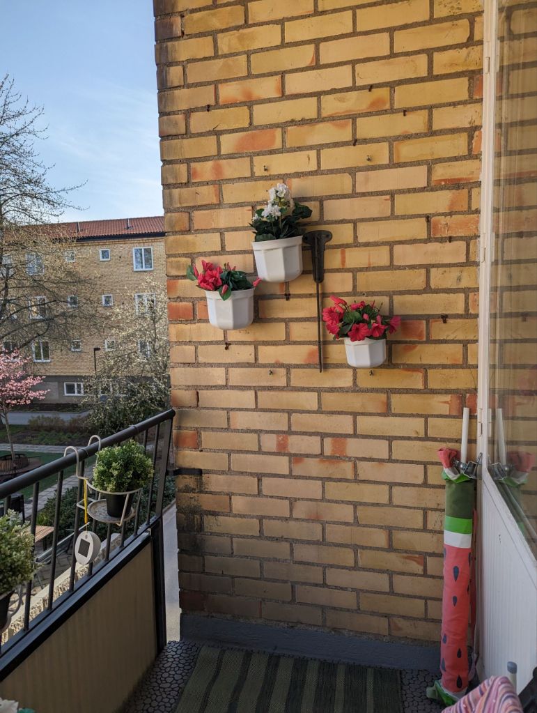 Sen knatade jag ner i källaren och hämtade upp några fuskblommor, och bar ner blomlådan. Och så tog jag ut den nya mattan och fixade fint på balkongen.
