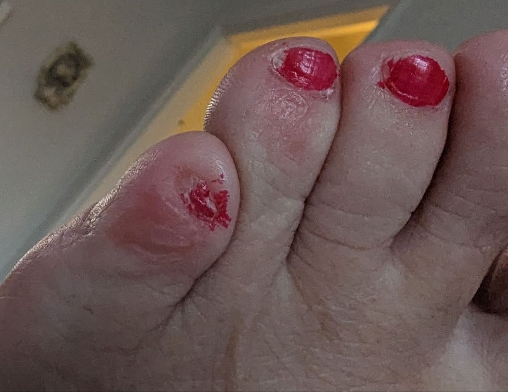 Mina stackars misshandlade fötter har blåsor på 2 olika ställen båda 2. Den ena lilltån har den största blåsan.