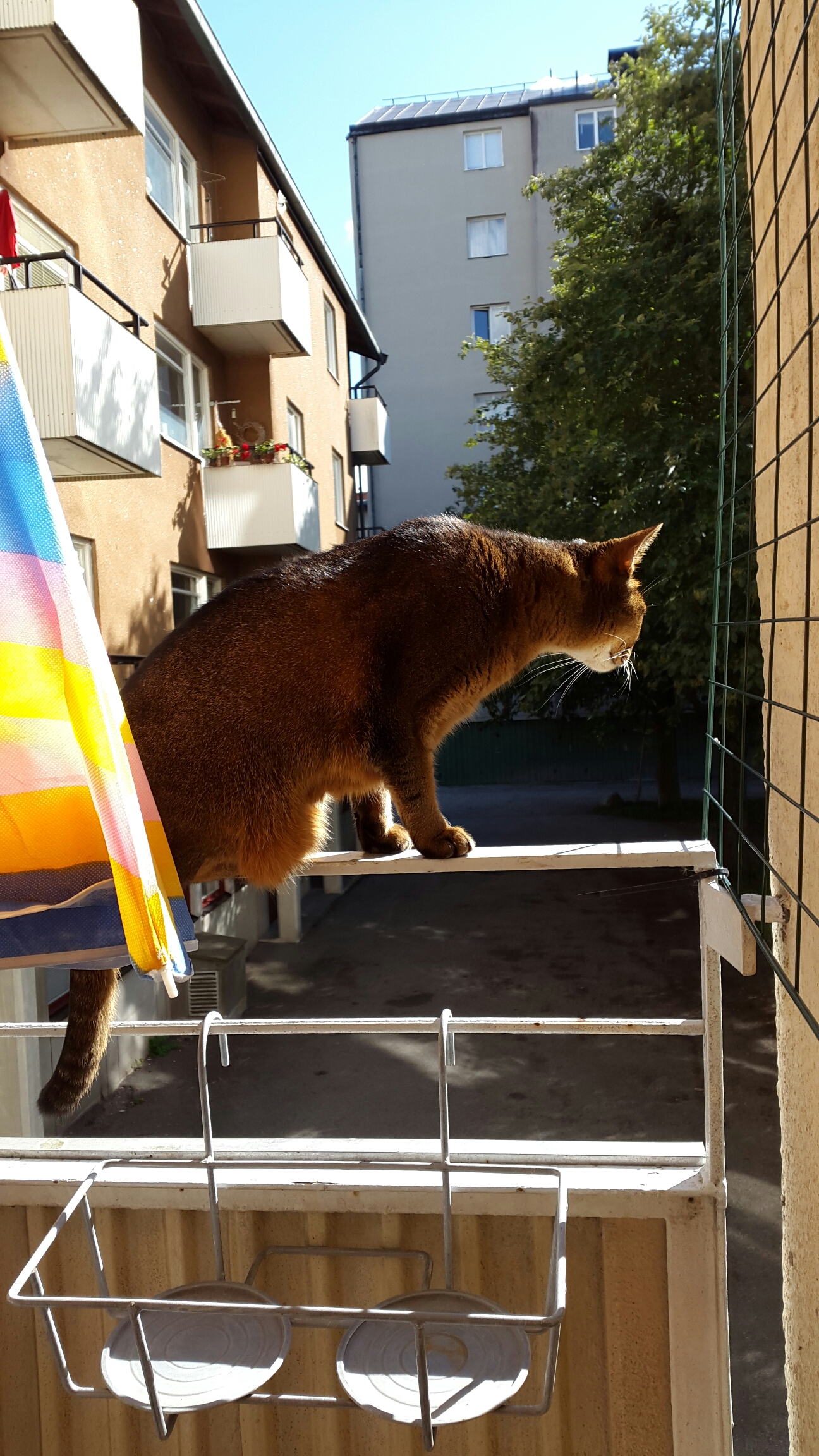 Nu sitter jag på balkongen och läser och dricker lattekaffe. Sylvester håller koll.