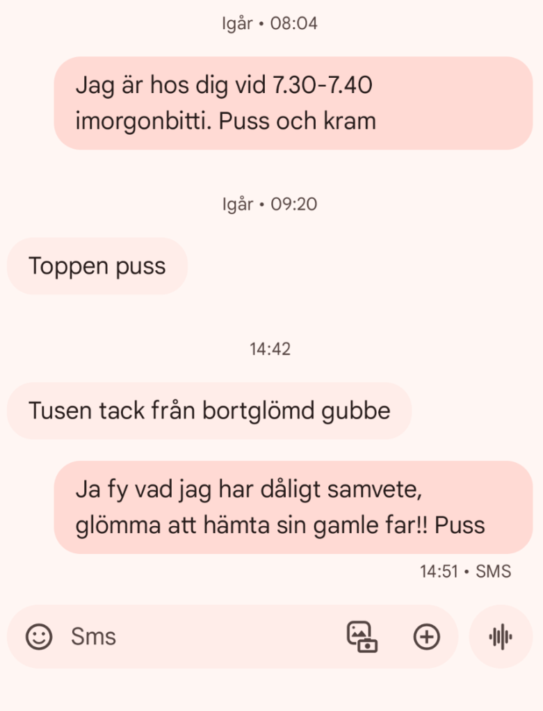 Där får jag ett mess från Lila: enligt schemat ska du jobba 1 timme till.